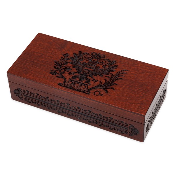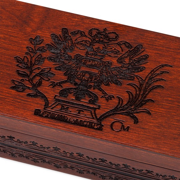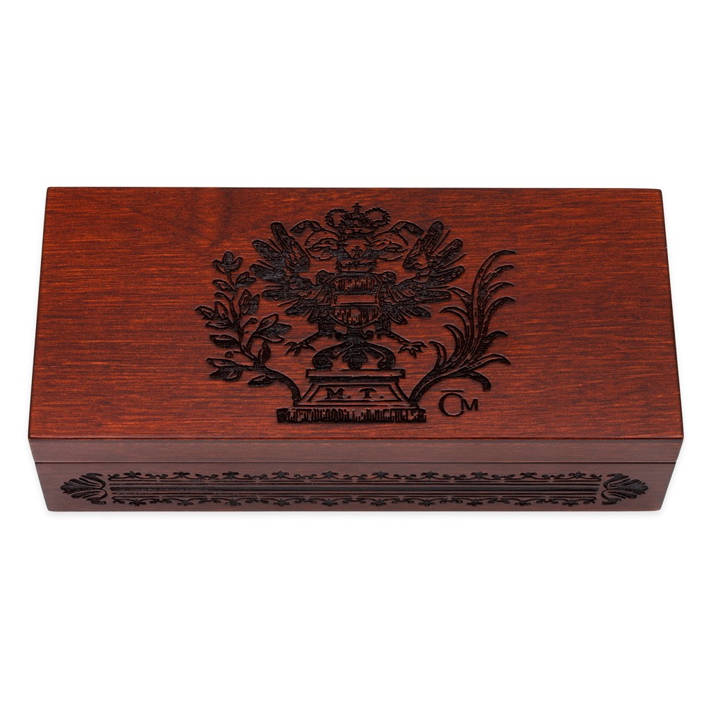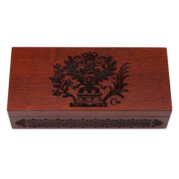 Víčku krabičky vévodí dvouhlavý orel s monogramem M. T. a po jejím obvodu se nachází dekorativní motiv. Obojí vychází z dobových ilustrací obsažených v originálních tereziánských zákonících.