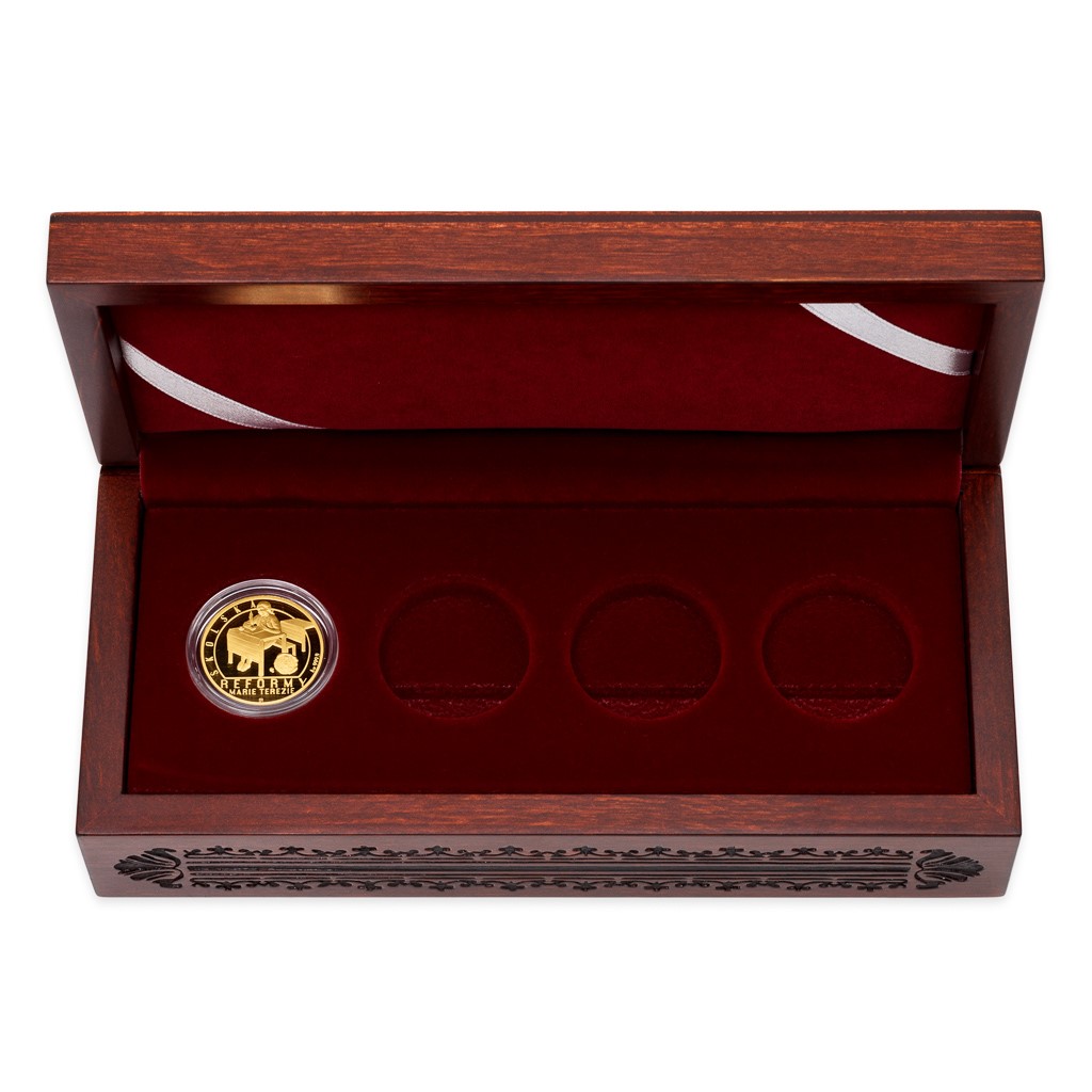 Sbírka čtyř zlatých ražeb připomíná školskou, hospodářskou, vojenskou a měnovou reformu a uložit si ji můžete do dřevěné etue ozdobené tematickou rytinou.
