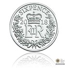 Reverzní strana šestipence předkládá monogram královny Alžběty II., královskou korunu, květinový dekor, nominální hodnotu SIXPENCE (GBP) a letopočet emise 2018. Averzní strana pak nese portrét panovnice doplněný opisem „ELIZABETH II DEI GRA REG FID DEF“ (Alžběta II., z Boží milosti královna, ochránkyně víry).